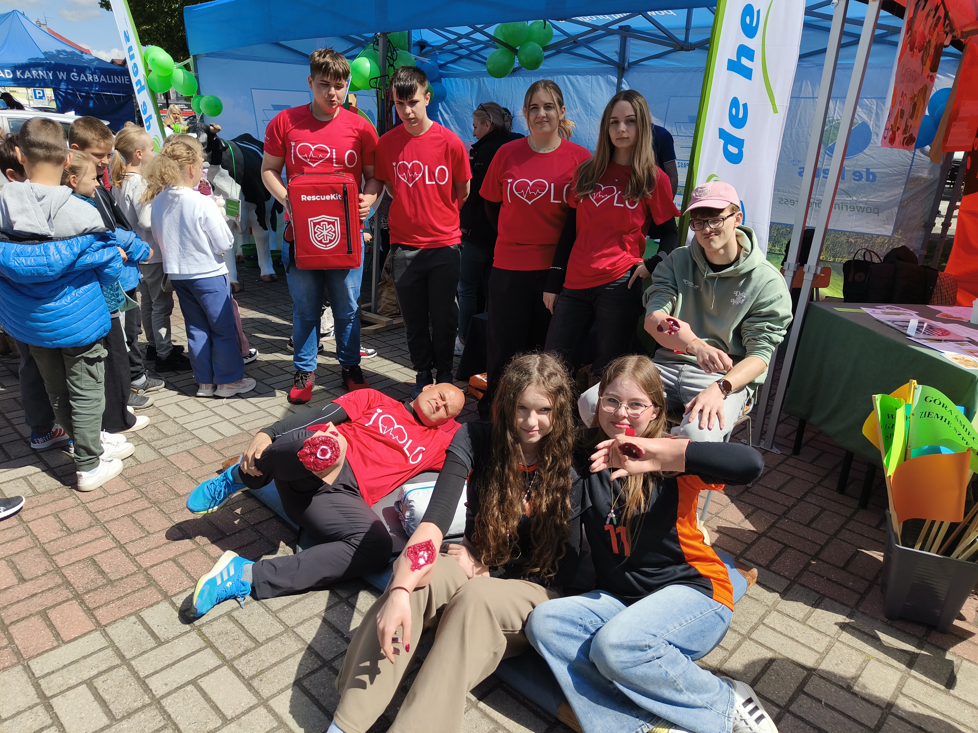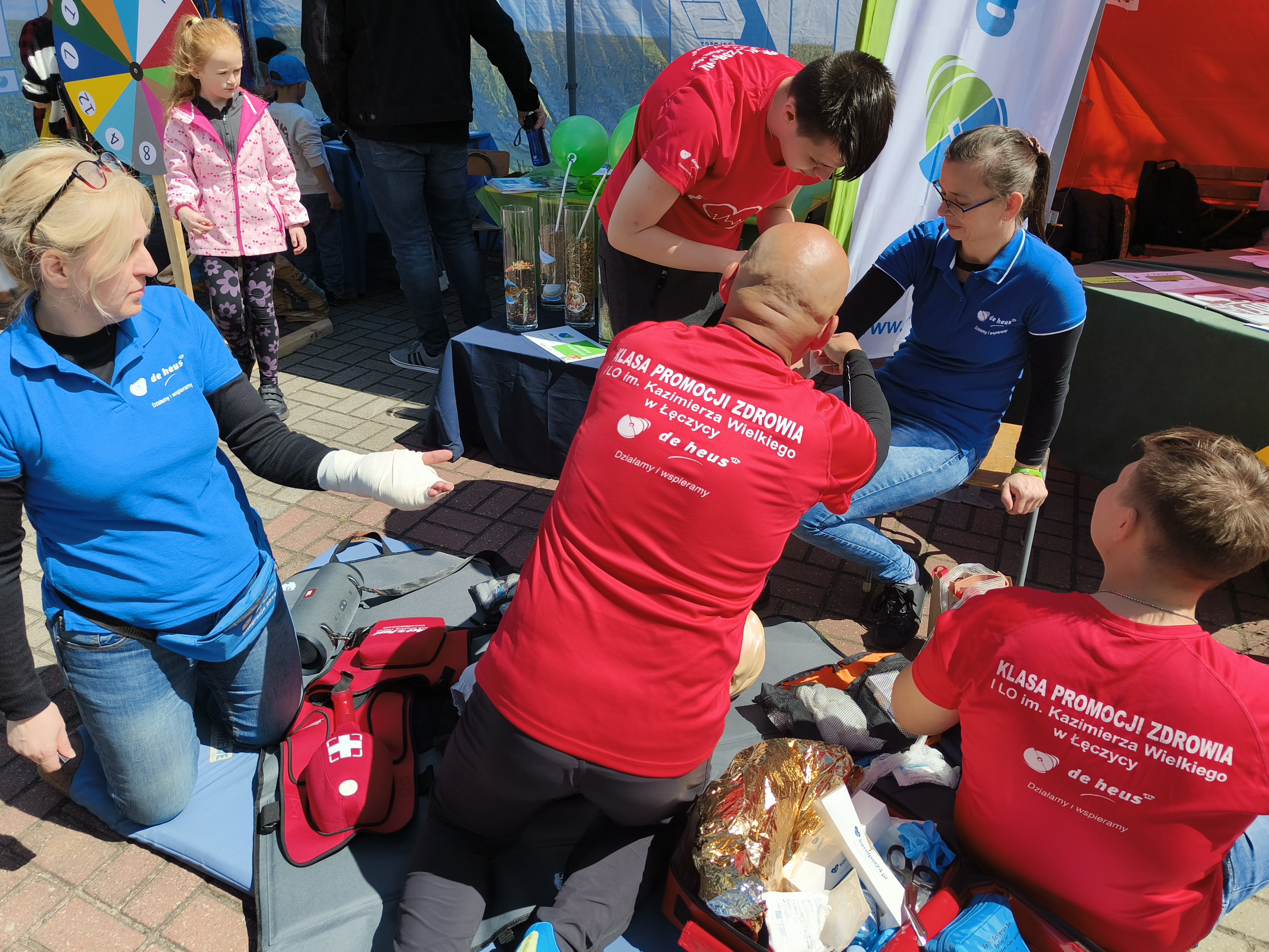 Uczniowie klasy promocji zdrowia razem z naszymi pracownikami wystąpili także na Powiatowej Majówce Zdrowia, gdzie zorganizowali pokazy ratownicze i „koło fortuny” z pytaniami o zwierzęta gospodarskie, zdrowe odżywianie i pierwszą pomoc. A po intensywnej nauce był czas na tatuaże, malowanie buziek i tworzenie kolorowych bransoletek.