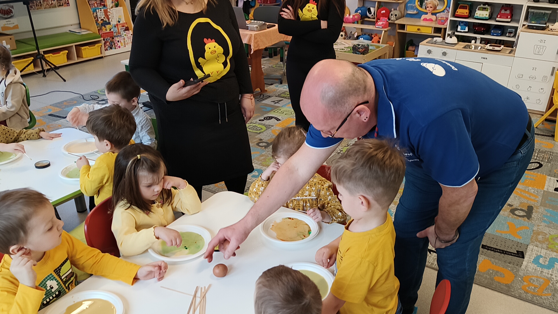 - eksperymenty mleczne i jajeczne, kolorowe malowanki, a także ruchowe zawody i konkursy.