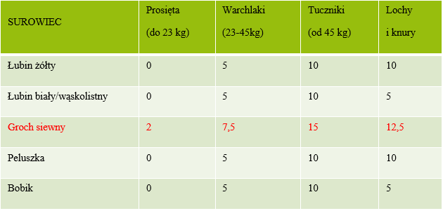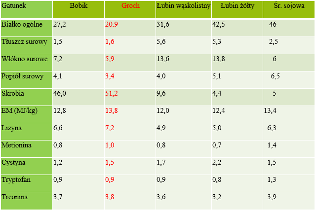Mają natomiast niewiele aminokwasów siarkowych, dlatego w mieszankach dla trzody groch dobrze bilansuje się z makuchem rzepakowym i śrutą, która bogata jest w metioninę.